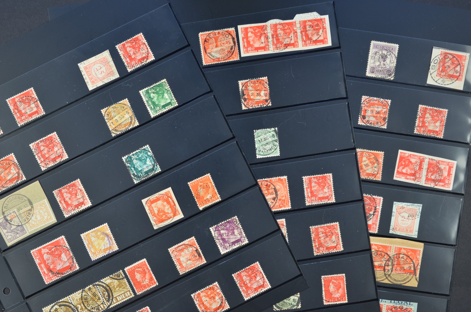 NED.- INDIË POSTHISTORIE, Puntvlakvullingstempels type PV1 en PV2 op losse zegels, verzameling van 62 verschillende kantoren type PV1 (o.a. Bengkalis, Blinjoe, Manokwari, Pemangkat, Rengat, Sintang, Terempa) en 48 type PV2 (o.a. Bengkalis, Blinjoe, Koba, Menado 16.3.40, Pekalongan, Sintang, merendeels prachtige en veelal complete afstempelingen op 3 insteekkaarten