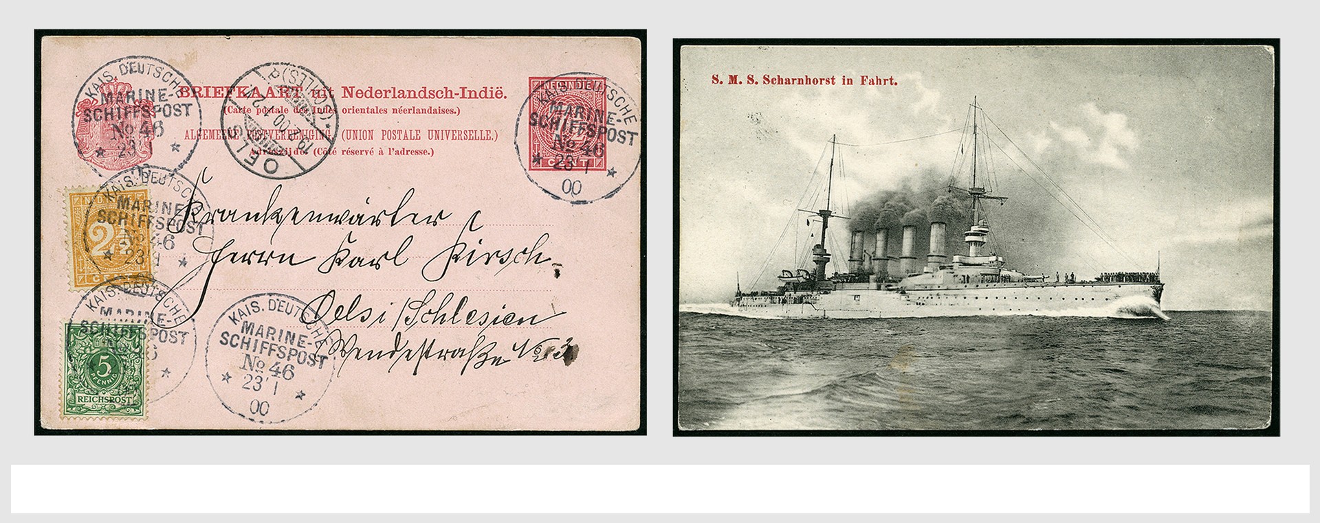 NED.- INDIË POSTHISTORIE, Duitse Marine in Azië, 5 bijzondere poststukken zoals beschreven en afgebeeld in het artikel ´Vreemde eenden in de bijt. Duitse oorlogsbodems in Indische wateren (1899-1914)´ door Han T. Siem (artikel bijgevoegd). Bijzonder en schaars materiaal!