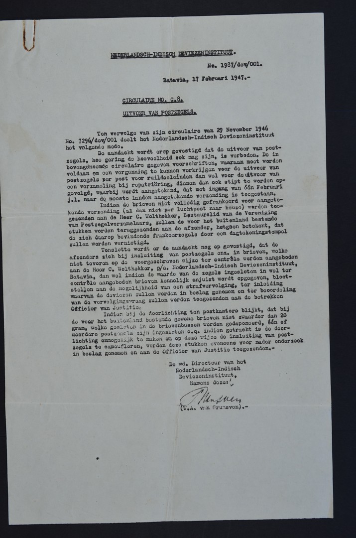 NED.- INDIË, twee circulaires van het Ned.- Ind. Deviezeninstituut van 29-11-1946 resp. 17-2-1947 betreffende de uitvoer van postzegels