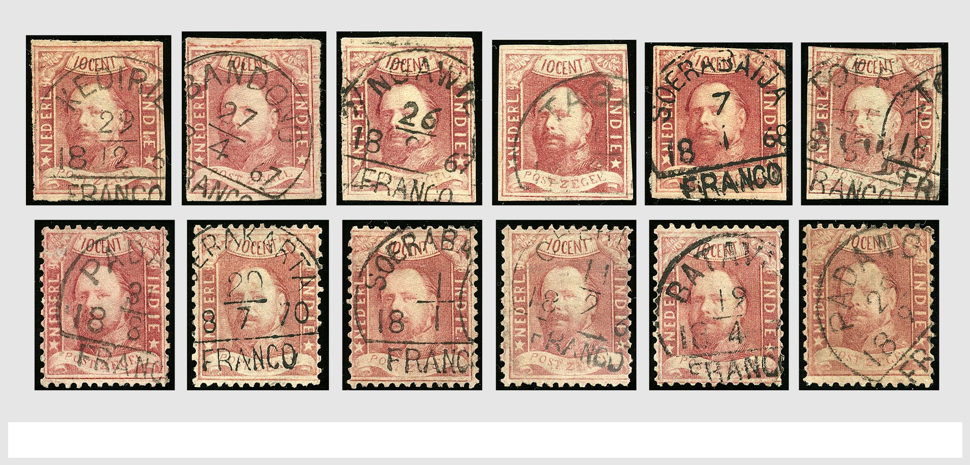 NED.- INDIË, 10 cent nr.1 (42x en 2 paren) w.o. gepositioneerde ex. en nr.2 (14x), merendeels prima zegels, op insteekkaart. € 9000