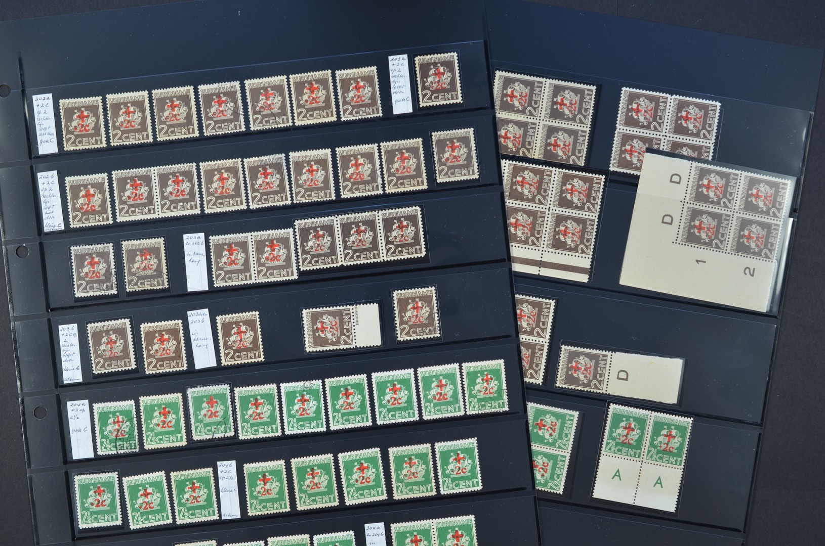 SURINAME, kleine o/*/** speciaalverzameling Rode Kruiszegels nrs. 202/205 met opdruktoevalligheden, grote C en kleine C w.o. in samenhang, strippen, (hoek)blokken, etc. op 2 insteekbladen