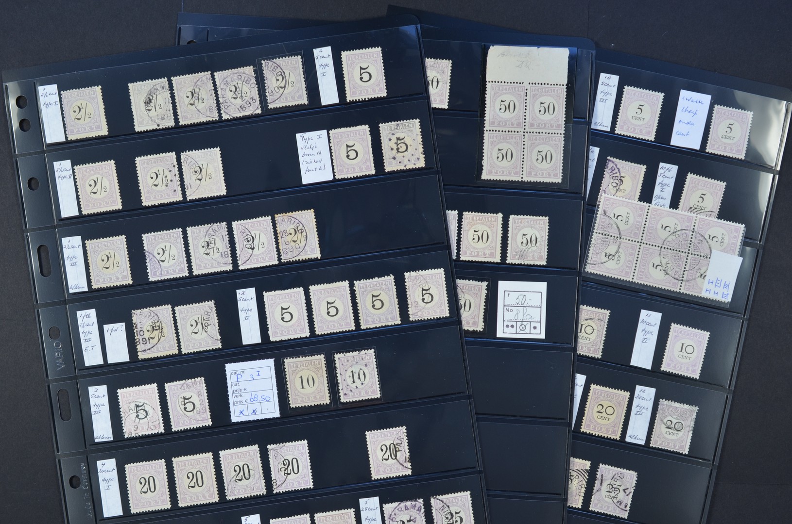 SURINAME, portzegels o/(*) emissies 1886 en 1892 met typen w.o. in samenhang, wat plaatfouten, etc. op 3 insteekbladen