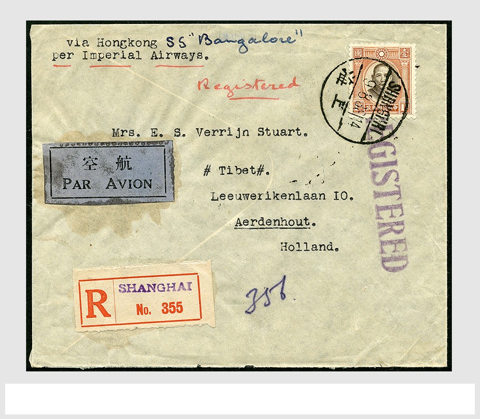 CHINA, 1$ Sun Yat Sen as a single franking on a registered airmail cover from Shanghai 9 Aug 1938 by S.S. ´Bangalore´ to Hong Kong 15 Aug and further ´per Imperial Airways´ and onwards to Aerdenhout, the Netherlands