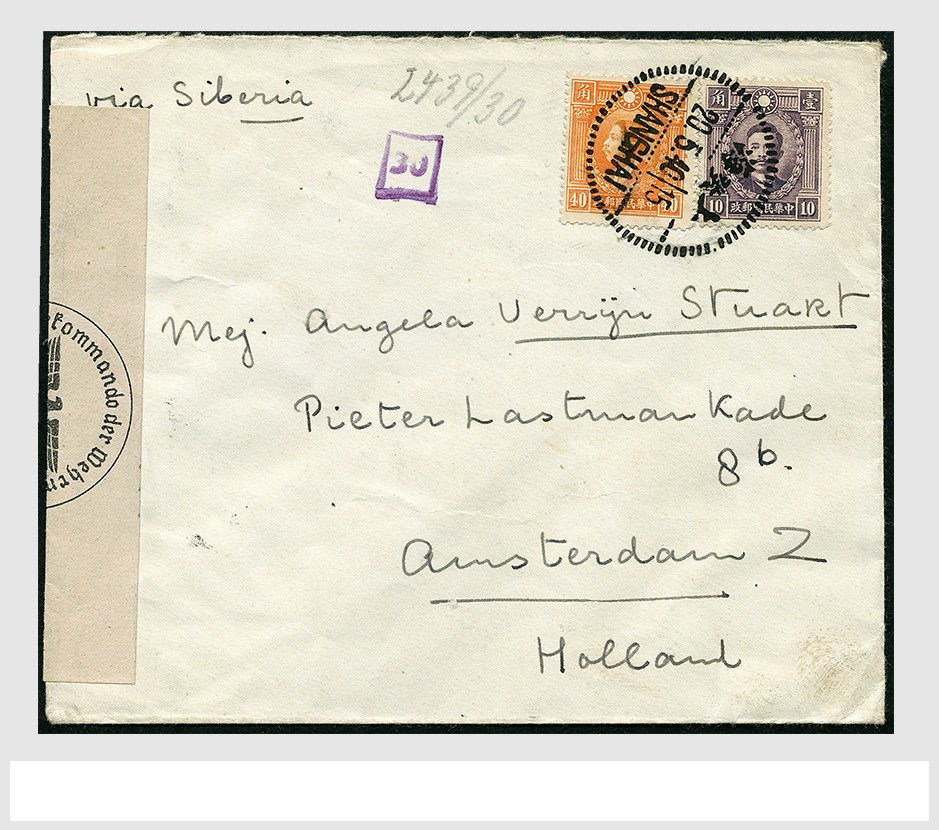CHINA, 10c Sung Jiao Ren and 40c Huang Xing on cover from Shanghai 20 May 1940 ´via Siberia´ to Amsterdam and censored by the Germans