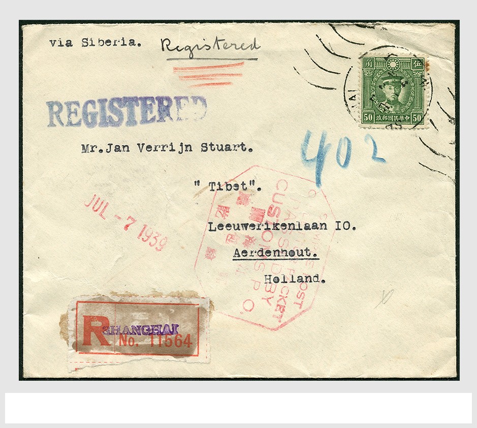 CHINA, 50c Chen Gi Mei as a single franking on a registered cover from Shanghai July 1939 ´via Siberia´ to Aerdenhout, the Netherlands. On the front a red cachet ´SAMPLE POST/OR LETTER PACKET/PASSED BY/CUSTOMS P.O.´ with date JUL - 7 1939