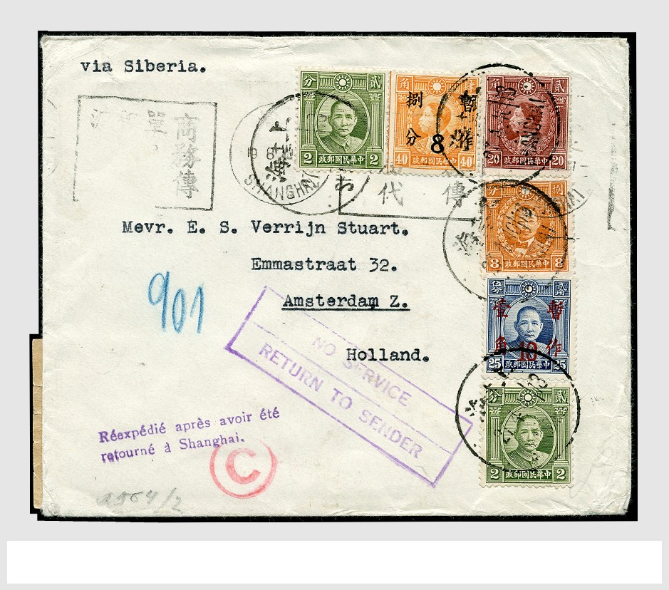 CHINA, cover franked with six stamps, five different, in total 50 cents, from Shanghai 27 Apr 1940 ´via Siberia´ to Amsterdam, showing German censors and violet cachets ´Réexpédié après avoir été/retourné à Shanghai.´ and framed ´NO SERVICE/RETURN TO SENDER´, back to Shanghai 19 Aug 1940. Fascinating cover