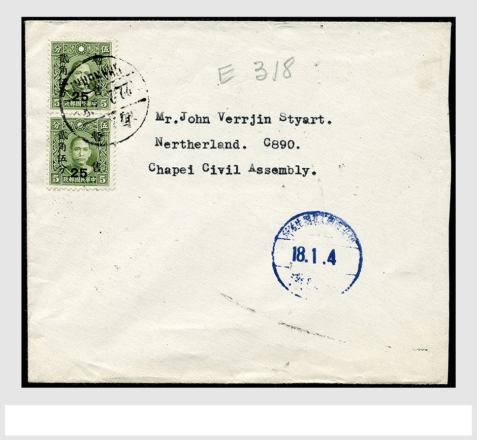CHINA, Prisoners of War. Cover franked with 25 on 5c overprint Sun Yat Sen in pair, issued in Central China during the Japanese occupation, from Shanghai 22 Feb 1943 to a Dutch prisoner in the Japanese internment camp ´Chapei Civil Assembly´ near Shanghai. Up to now we have not come across other correspondence to a Dutch prisoner of the Japanese in an internment camp in China. Very rare