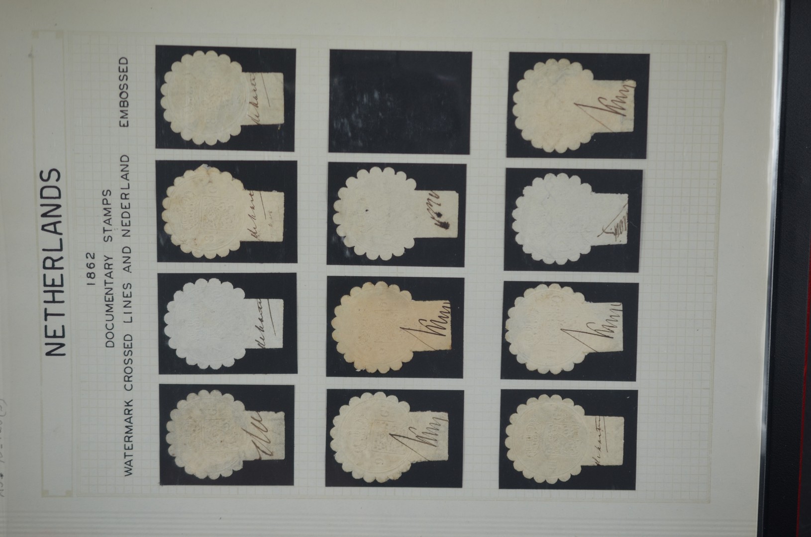 FISCAALZEGELS, Collectie Kwitantie- of Plakzegels, tentoonstellingscollectie Documentary Stamps 1829-1899 van de vooral in de USA bekende verzamelaar en auteur Johannes de Kruyf (1906-99), met in preegdruk aangebrachte zegels, geperforeerde en ongeperforeerde zegels van diverse waarden en modellen, aangevuld met stukken waarop plakzegels, kwitanties met frankeer- en plakzegels, diverse extra´s, in Leuchtturm-album. Unieke koop voor de collectionneur!