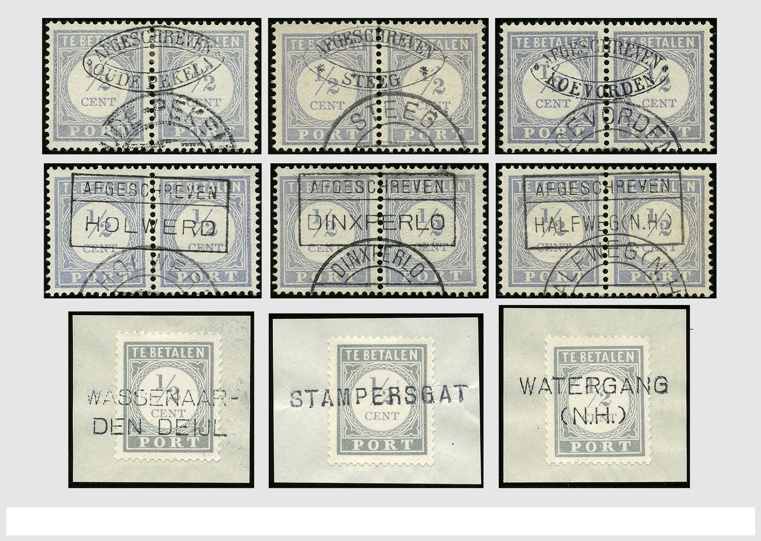 POSTHISTORIE, portzegels van diverse emissies en waarden los of op knipsels met bijzondere afstempelingen als ovaalstempels ´Afgeschreven´ van verschillende kantoren (veel op verzoek), ´Nietig´ in meerdere types, en dergelijke stempels ook op enkele andere zegels, alsmede 2 interessante portstukken, in insteekboek