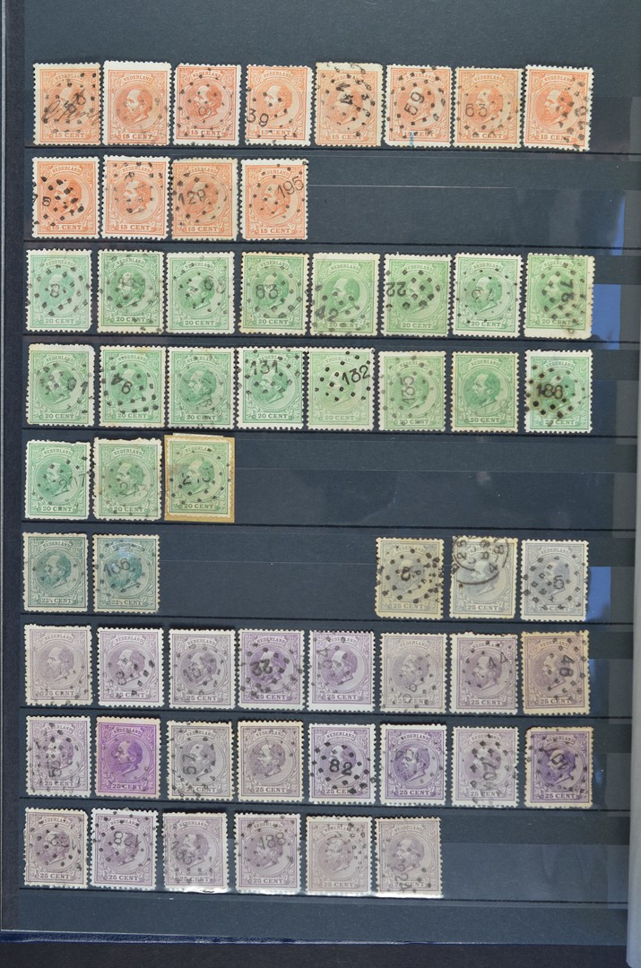 1852-ca.1915, gebruikt in 2 insteekboeken, waarbij enkele aardige ex. 1e emissie, daarna met vele aardige afstempelingen Punt-, kleinrond-, naam-, besteller-, LB en KB, etc.