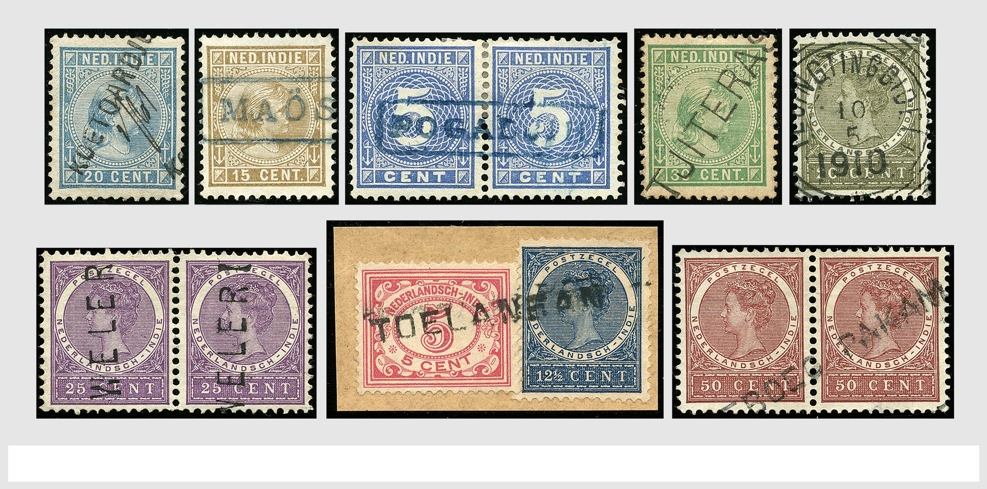 NED.- INDIË 1870-1908, verzameling zegels tussen nrs. 3-97 in aantallen met diverse stempels w.o. punt-, kleinrond-, vierkant-, halte- en veel naamstempels w.o. betere en mooie afdrukken, als ook enkele proeven type Veth en een paar poststukken, opgezet op bladen in Importa-album