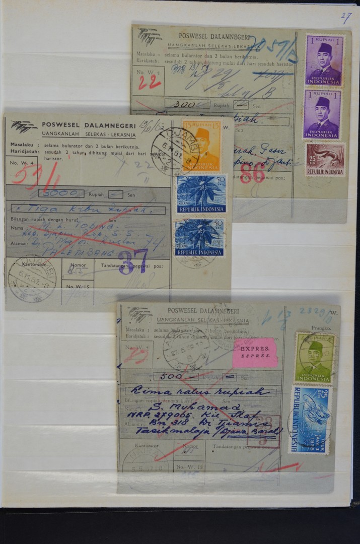 INDONESIË, ruim 540 postwisselformulieren jaren ´60 waarvan veel met frankeerzegels en niet alleen Soekarno, met afstempelingen van diverse kantoren w.o. zeer kleine, administratieve notities, port betaald (= porto dibajar), stempels (veel Malang) en enkele etiketten w.o. expresse, 1 adreskaart en 1 betalingsbevestiging (roze kaart X3), in 6 insteekboeken