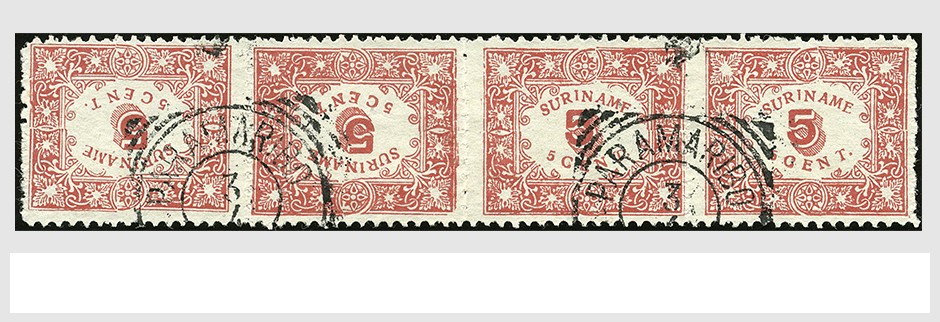SURINAME Hulpuitgifte 1909 nrs. 58/59, 58a/59a, o/(*) los, strips, blokken, veldelen, keerdrukken in blokken, druktoevalligheden, etc. in insteekboek