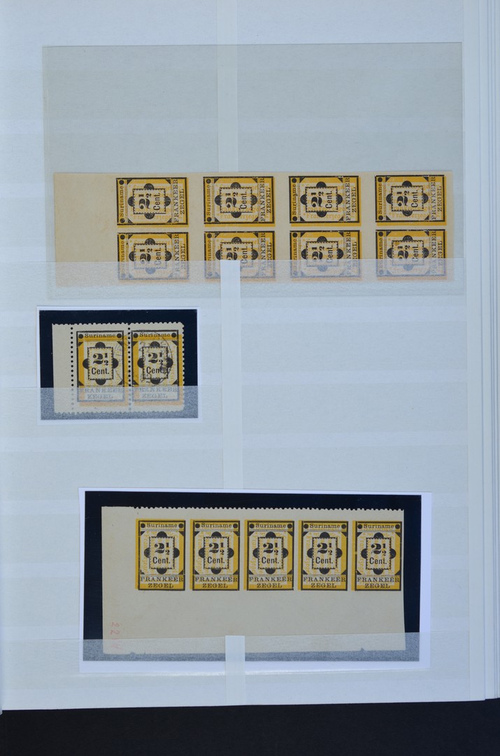 SURINAME, speciaalcollectie Hulpzegel 1892 nrs. 22-22a o/(*), typen, talloze tandingvariëteiten als ongeperforeerde zijde, dubbele perforatie, en drukvariëteiten als verschoven geeldruk of zwartdruk, gedeeltelijk weggevallen druk, zegel met stempeldatum 12-8-1892 (= vroegst bekend), los, in paren, strippen, blokken, veldelen, veelal gepositioneerd en gedocumenteerd, in insteekboek. Mooi object om op te zetten!