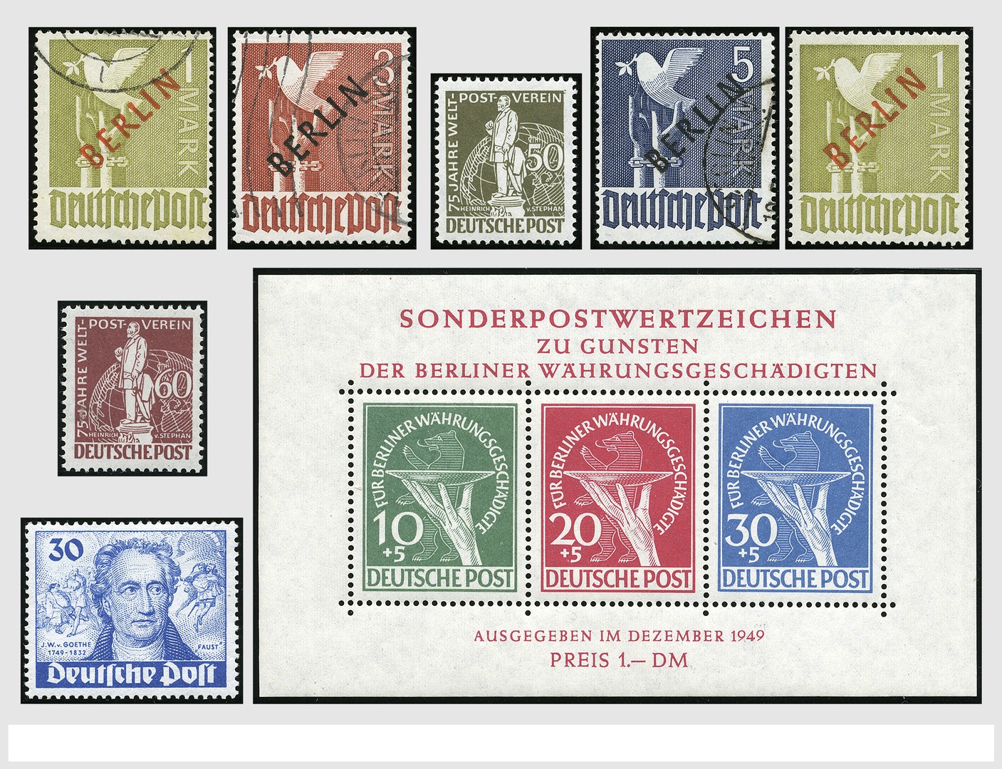 BERLIJN 1948-1990, collectie deels dubbel verzameld zowel gebruikt als ongebr. resp. postfris waarbij rood- en zwart opdrukken, Von Stephan, Goethe, blok 1, etc., in 2 insteekboeken. Mooie collectie met hoge waarde!