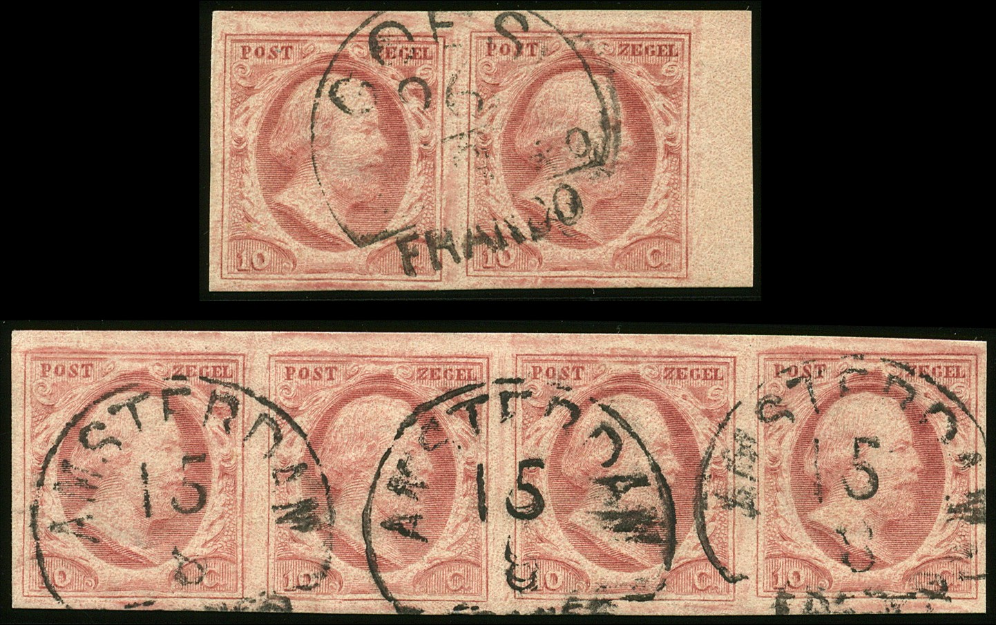 2j, 10 Cent plaat V, gevlekte druk, 4 losse zegels, 12 paren, 2 strippen van drie en 3 strippen van vier, uit de bovenhelft van een plaatreconstructie, posities 1/3, 2/5, 6/7, 8, 9/10, 11/12, 13/14, 14/15, 16/17, 17/18, 19/20, 21, 22/25, 26/27, 27/28, 28/30, 31/32, 36, 37/40 (Amsterdam C zonder jaar) en 41/42. Prima tot zeer breed gerande ex. w.o. randstukken en meerdere ex. met Franco in kader