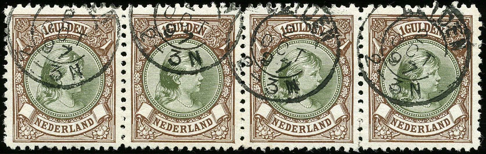 46C, 1 gulden bruin en olijf, Lijntanding 11, gebruikte prachtstrip van vier € 320+