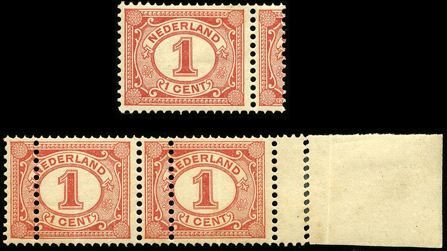 51, 1 cent Vürtheim met variëteit ´Verschoven verticale perforatie´, postfris randpaar (gom paar minieme bruine puntjes, aan vz. niet zichtbaar) en twee ongebruikte losse ex. (met keur A.C. Voss). Zie: HPN A8-259/280 en daaruit afb. 515