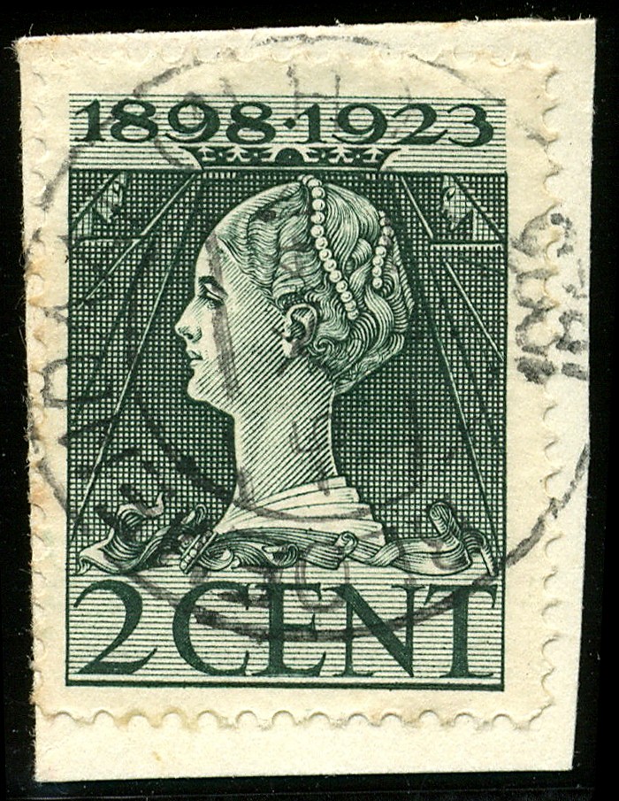 121H, 2 cent Jubileum 1923 in Lt. 11½ x 12½, prachtex. op briefstukje met vroegst bekende afst. Bloemendaal 5-10-1923. Zie: HPN A12-53, A12-1H