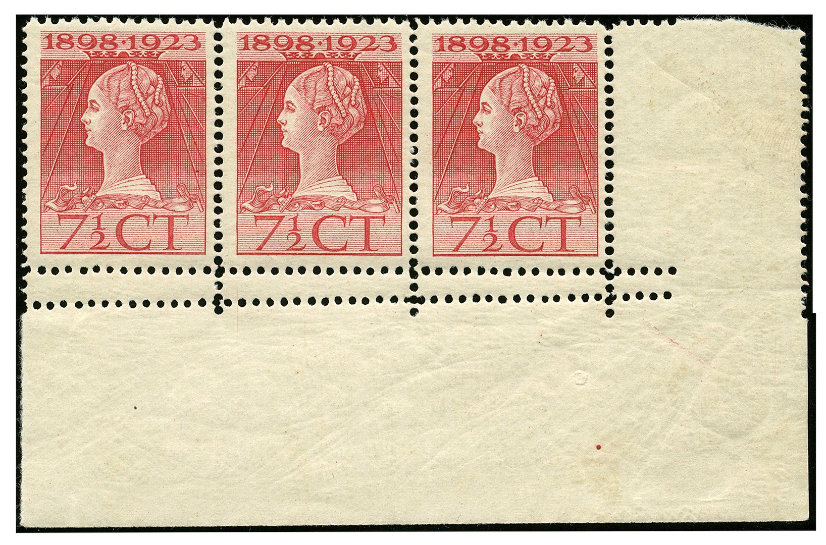 123, 7½ cent Jubileum 1923, postfrisse of ongebruikte losse zegels (4x), verticale paren (2x), strip van drie en veldeeltje van vier, allemaal met perforatiefouten. Zie o.a.: HPN A12-61, afb. 131