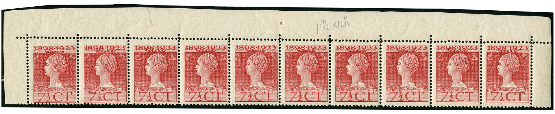123H, 7½ cent Jubileum 1923 in Lt. 11½ x 12½ met variëteit ´Schuin lopende horizontale perforatie´, postfrisse bovenrand strip van tien