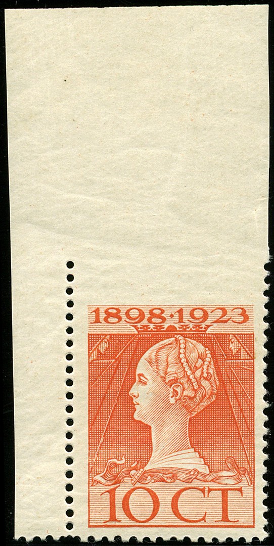 124Gv, 10 cent oranjerood, bovenzijde ongeperforeerd, postfris prachtex. met klein plakkerrestje aan de bovenzijde van de velrand € 600+