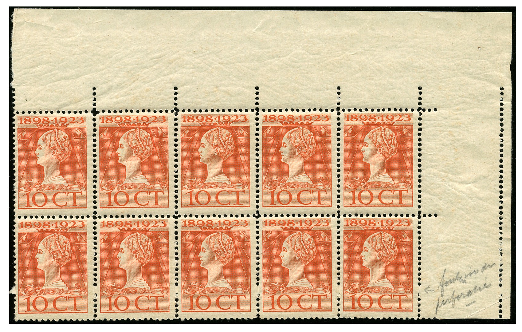 124H, 10 cent Jubileum 1923 in Lt. 11½ x 12½ in postfris hoekblok van tien waarbij de zegels van de tweede rij een perforatiefout hebben (1 pen ontbreekt)