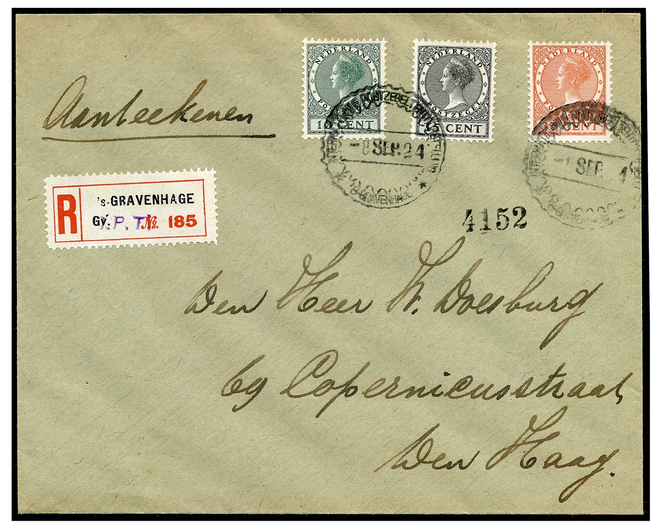 136/38, Tentoonstellingsserie op envelop, afgestempeld met speciaal rubberen stempel op 8-9-1924 en aangetekend verzonden, met op R-strookje in violet gestempeld ´I.P.T.´
