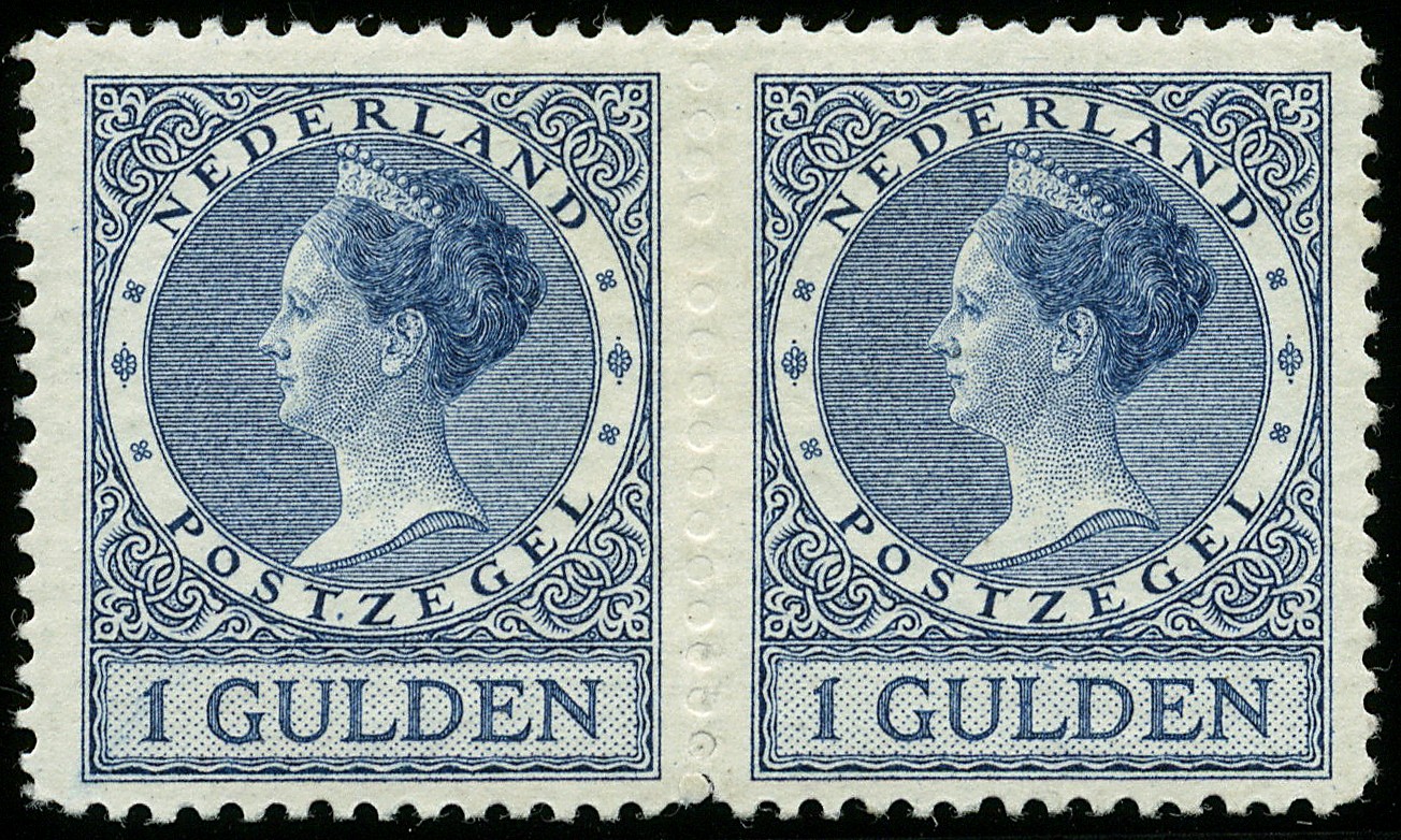 163Bva, 1 gulden Veth in paar met variëteit ´Midden ongetand door niet doorgekomen perforatie´, ongebruikt prachtpaar met zeer lichte plakkerspoor. Zeer zeldzaam! € 2750