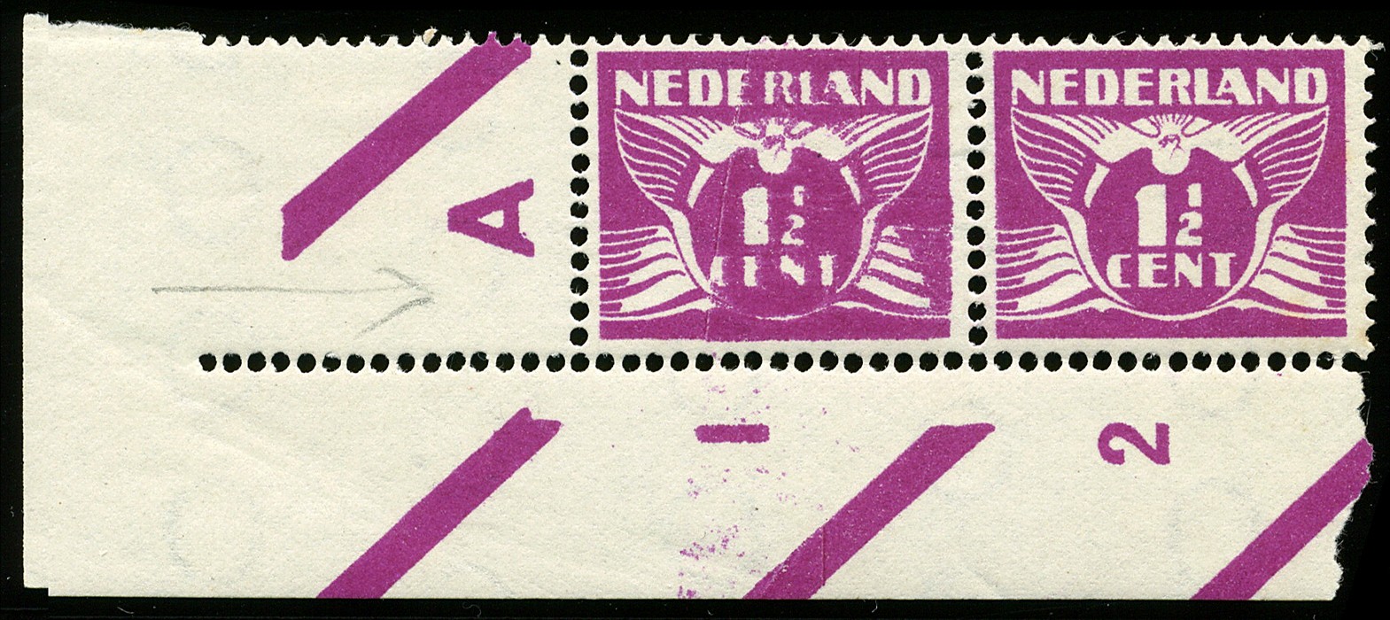 171A, 1½ cent Lebeau, postfris hoekpaar waarvan de linkerzegel met variëteit ´Deels met verschoven druk´, alsmede postfris randpaar met variëteit ´Verschoven horizontale perforatie´