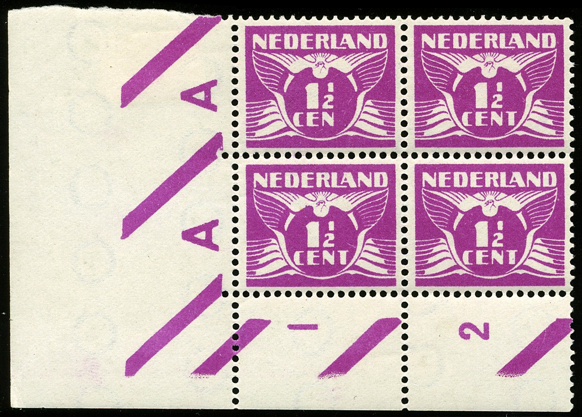 171Af, 1½ cent Lebeau met variëteit ´CEN i.p.v. CENT´ in postfris hoekblok van vier met drie normale ex. (plakker op velrand). € 275