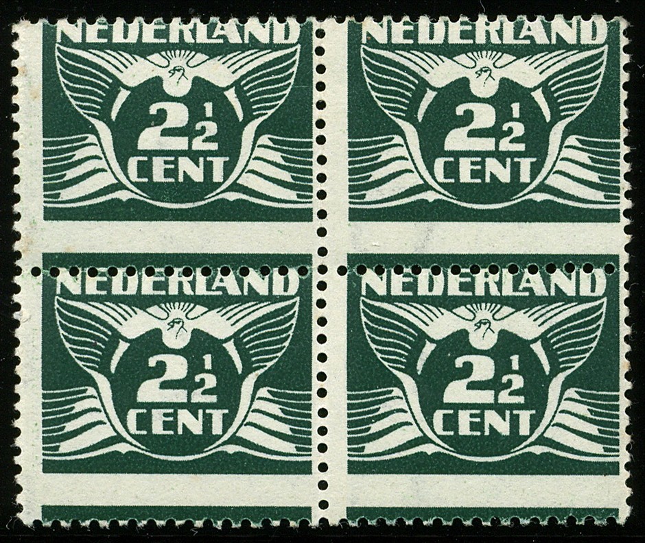 174B, 2½ cent Lebeau met variëteit ´Sterk verschoven horizontale perforatie´, ongebruikt blok van vier (az. enkele miniem bruine puntjes)