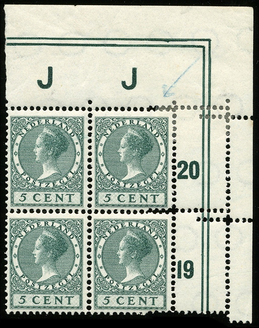 177A, 5 cent Veth met perforatiefouten in ongebruikte hoekblokken van vier (oplageletters E en J, 1 ex. az. bruin puntje), alsmede ongebruikt verticaal hoekpaar met variëteit ´Extra perforatie in verticale velrand´