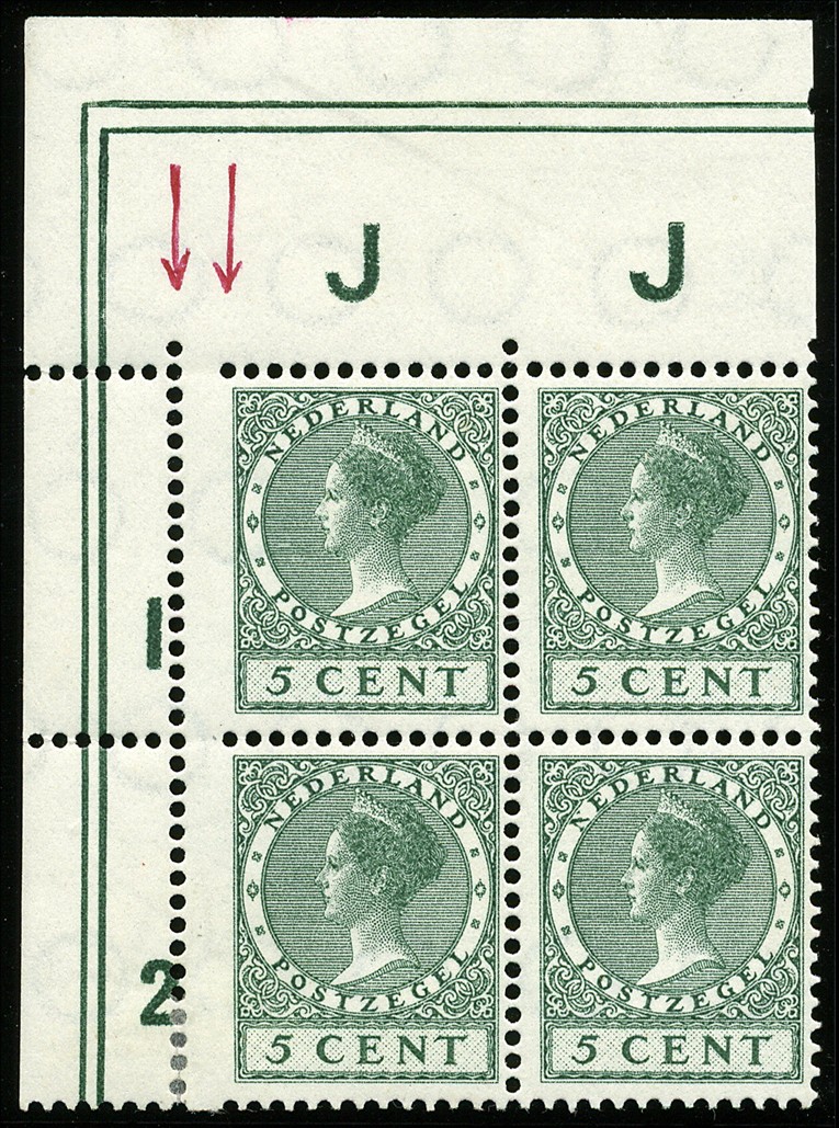 177A, 5 cent Veth met variëteit ´Extra slag verticaal links, waardoor bredere zegel´, in ongebruikt hoekblok van vier (az. een bruin puntje) en twee losse ex.