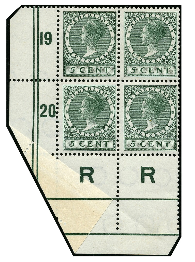 177B, 5 cent Veth in ongebruikte hoekblokken van vier (oplageletters R en X) met omgevouwen hoeken in velrand