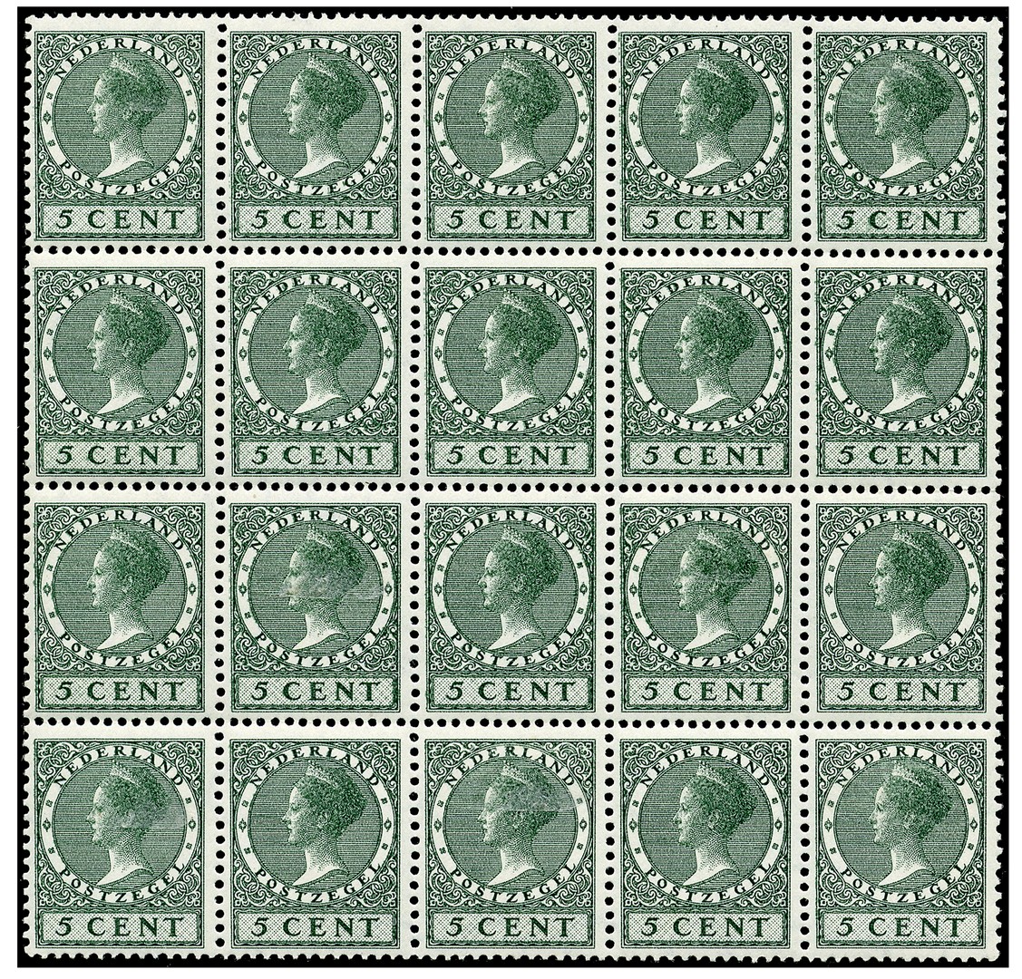177B, 5 cent Veth in postfris blok van twintig zegels met op gomzijde spiegeldruk