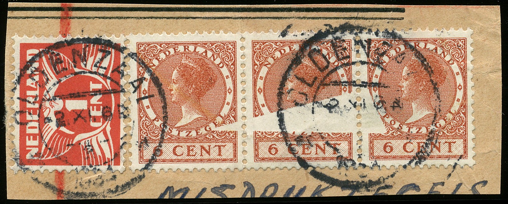 178B, 6 cent Veth in strip van drie met variëteit ´Gedeeltelijk onbedrukt´ door papiersnipper, op briefstukje
