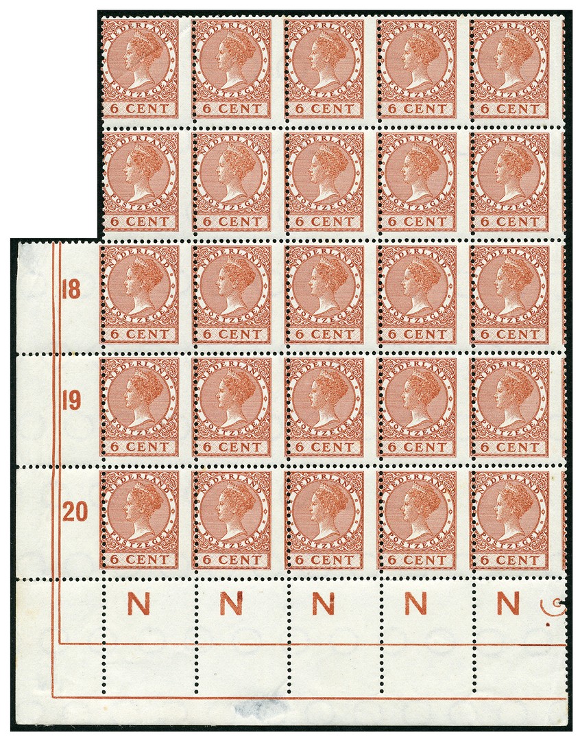 178B, 6 cent Veth met variëteit ´Verschoven verticale perforatie´ in postfris hoekveldeel van vijfentwintig (1 ex. vouw, velrand onder vastgeplakt geweest)