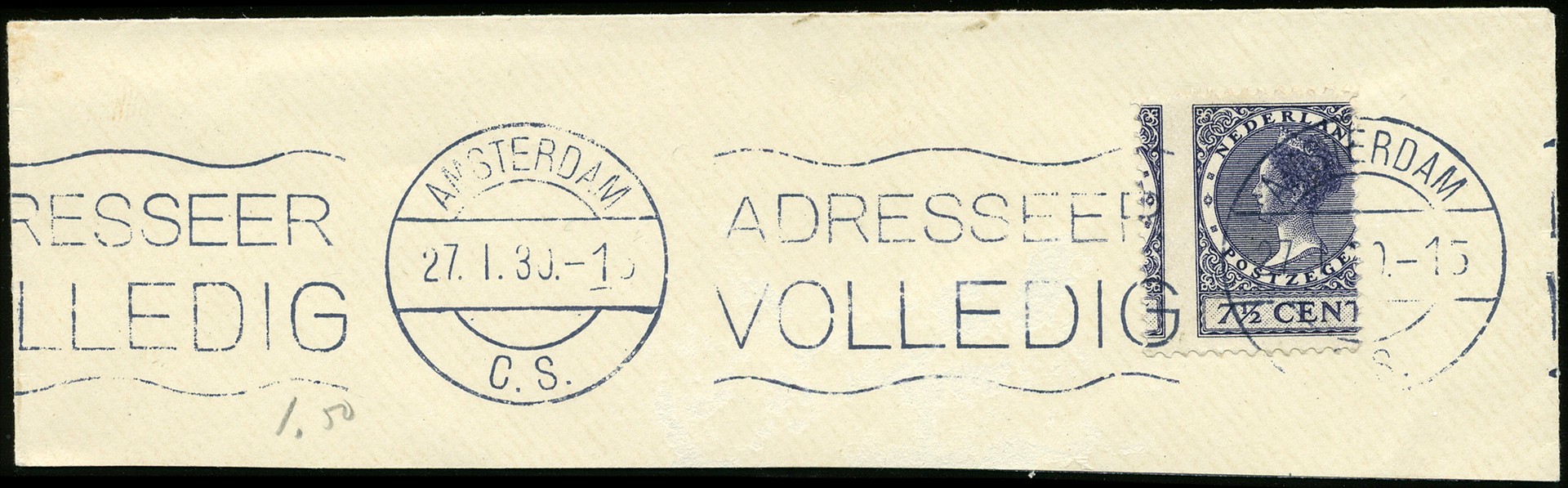 179A, 7½ cent Veth violet met variëteit ´Sterk verschoven verticale perforatie´, prachtex. op briefstuk machinaal afgest.