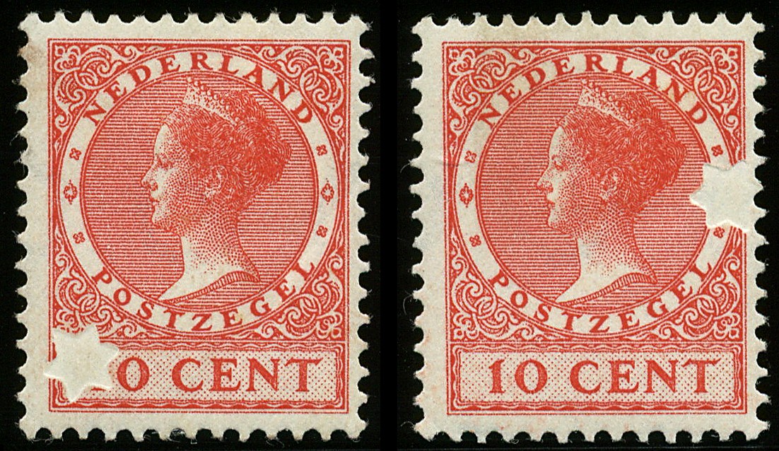182A, 10 cent Veth lichtrood met variëteit ´Deels onbedrukt door papiertje van knipteken ster´, drie ongebruikte prachtex. met deze toevalligheid op drie verschillende plaatsen