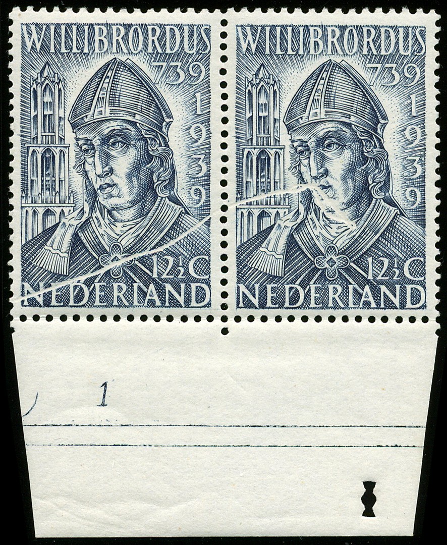 324, 12½ cent Willibrordus 1939, postfris pracht randpaar met harmonicavouw, in de velrand plaatnummer 1 en een knipteken