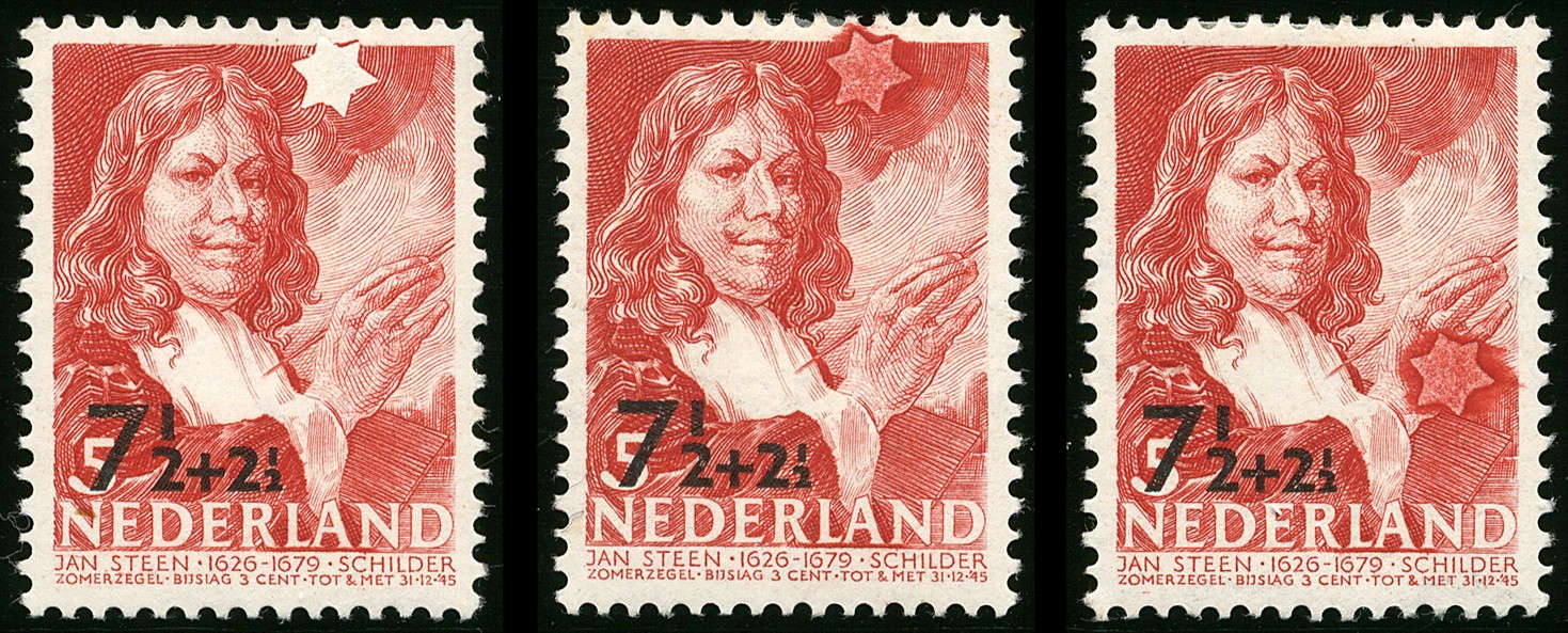 354, 7½+2½c op 5c Zomer 1940 ´Jan Steen met de Ster´, gestempeld hoekblok van vijftien zegels met in velrand knipteken in de vorm van een ster, tevens vijf ongebruikte zegels allemaal met deze ster op het zegelbeeld, drie geheel wit (dus daar onbedrukt) en twee rood. Artikel uit NMPh 1946 bijgesloten. Interessant geheel!
