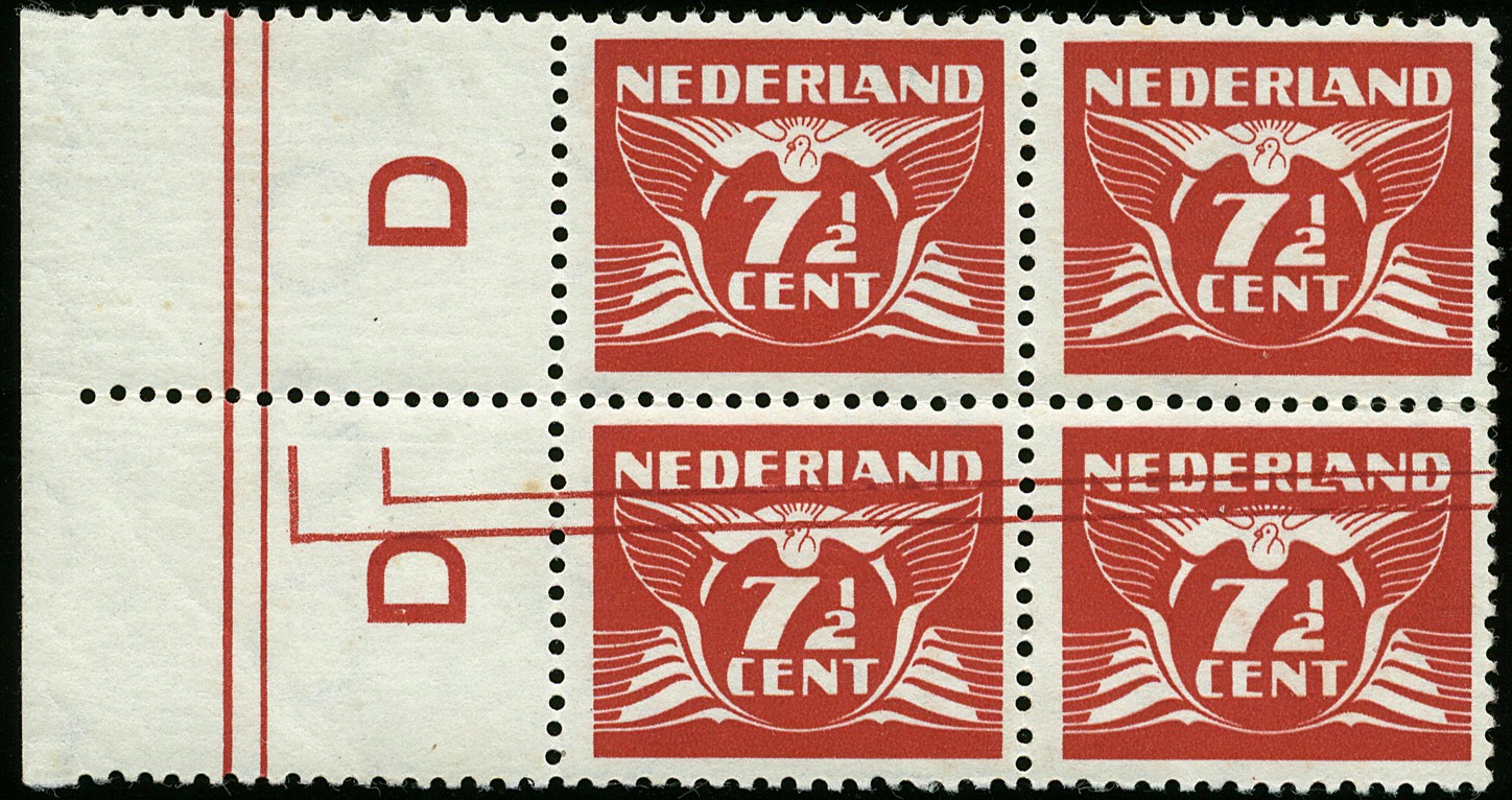 381, 7½ cent Lebeau in randblok van vier (3 ex. postfris) met variëteit ´Velrandbedrukking (strepen) deels op onderste zegels´