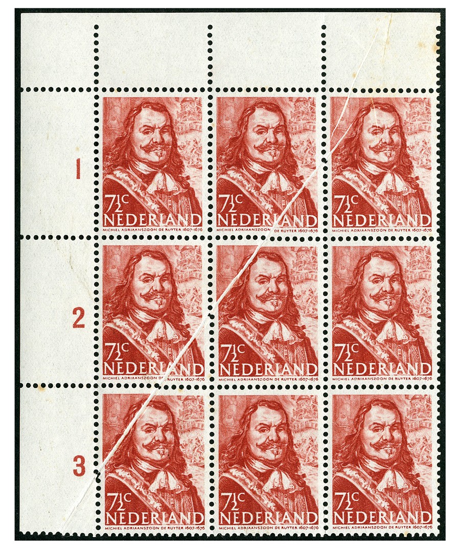 412, 7½ cent Zeehelden in ongebruikt hoekblok van negen (1 ex. bruin puntje) met harmonicavouw