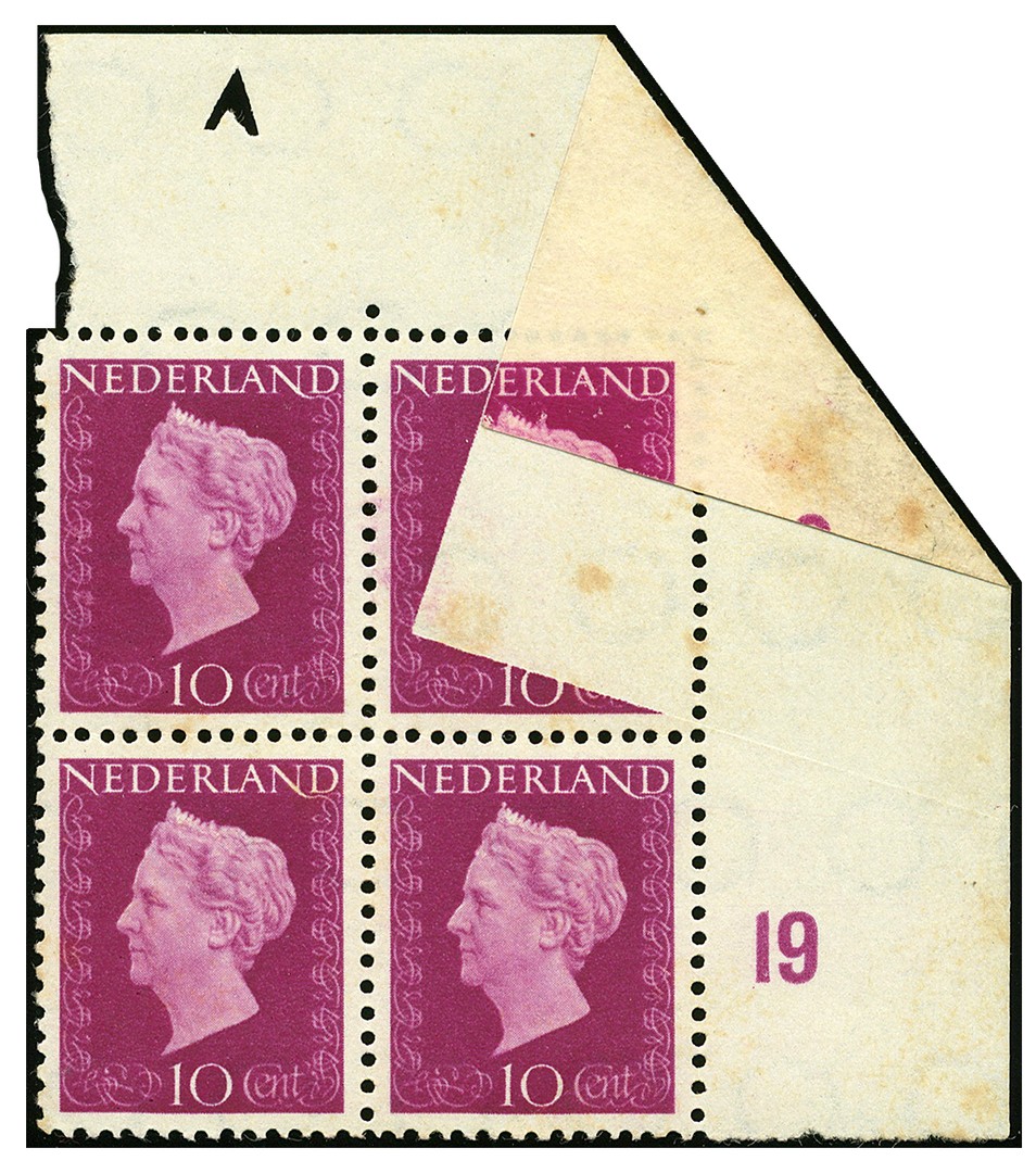 478, 10 cent Wilhelmina in postfris hoekblok van vier met variëteit ´Zegel rechtsboven deels onbedrukt door omgevouwen velrand´, vrijwel prachtblok (minieme bruine puntjes)