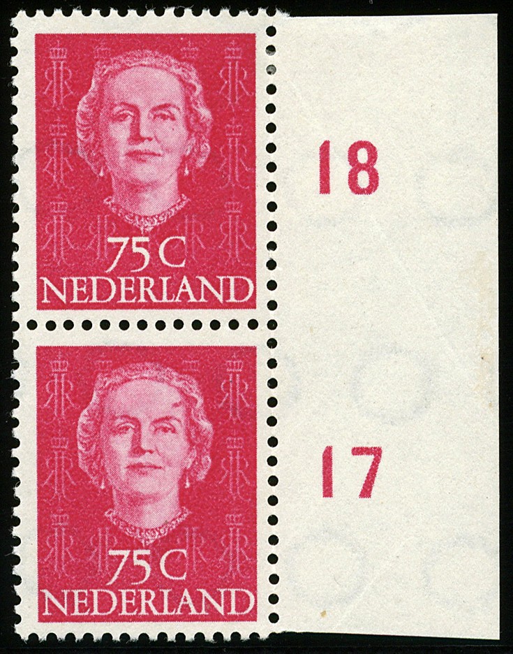 533P, 75 cent Juliana en Face met plaatfout ´Rode punt op voorhoofd´, postfris randpaar met normaal ex. € 460