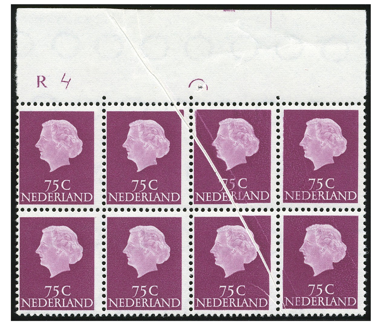 633, 75 cent Juliana en Profil, postfris randblok van acht (met velrandbijzonderheden) met harmonicavouw