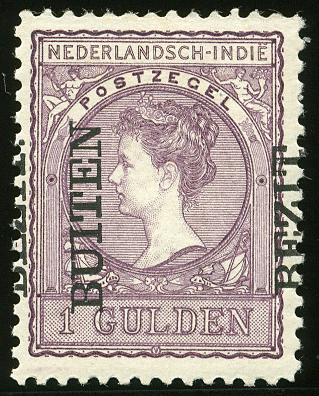 97fb, 1 gld. doflila met opdruk Buiten Bezit sterk verschoven, postfris prachtex. met cert. NKD (2013) € 400++