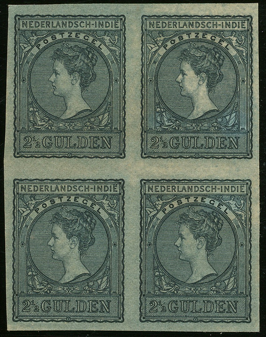 PC.61/62, 1 en 2½ Gulden type Veth uit 1911 in de gekozen kleuren, op blauw papier zoals in 1912 uitgegeven, ongetand, ongegomd, prachtblokken van vier. Zeldzaam! Fl. 1200