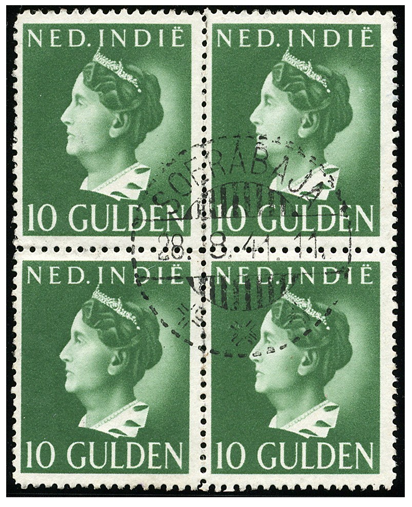 288, 10 gulden koningin Wilhelmina in prachtblok van vier met afstempeling Soerabaja 28-8-1941, 5 dagen na de vroegst bekende gebruiksdatum
